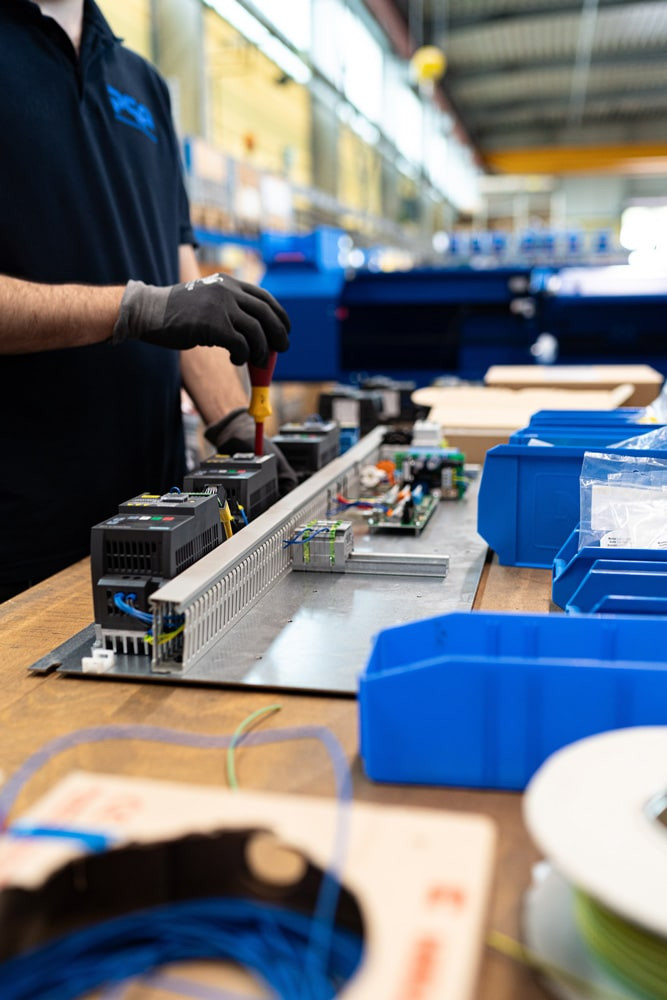 In unseren Produktionsräumen entstehen dann die halbautomatischen Stretchwickelmaschinen. Hier kommen alle Komponenten zusammen. Nach der vollständigen Montage und umfangreichen Funktions- und Qualitätsprüfungen verlässt die fertig verpackte Maschine unsere Produktion und wird an den Kunden versandt.